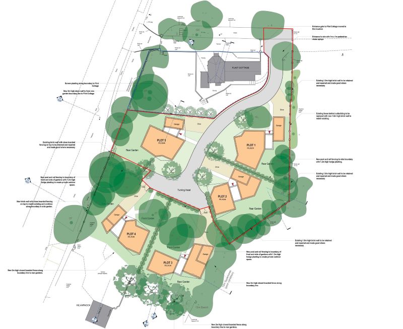 For the avoidance of any doubt, the site offered is indicated by the red outline in the main image. The land for sale will house three of the five detached houses referred to in the planning application.