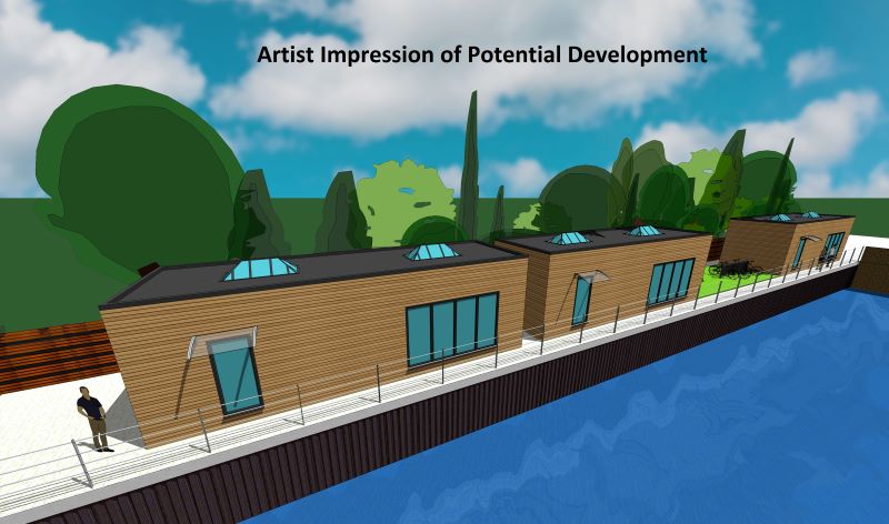 The property comprises a site measuring approximately 242 sq m (2,613 sq ft). The artist's impression shows a development comprising 3 x 1 bedroom starter homes with pedestrian and cycle access via the existing bridge.